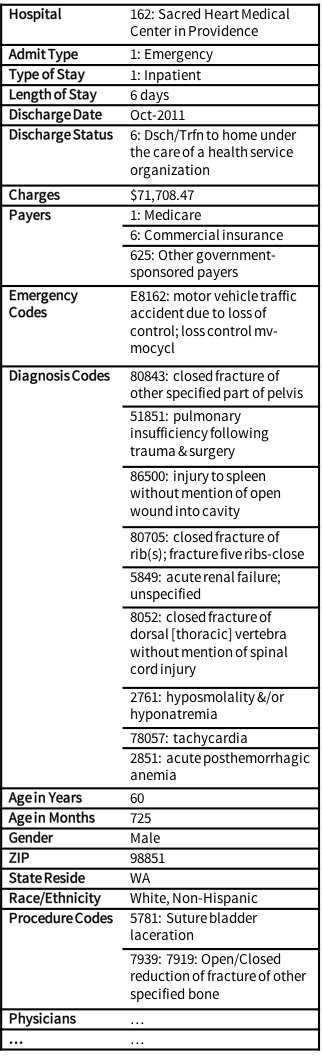 The biggest provider of health data documented on the HealthDataMap is discharge data provided by U.S. states. If you go to the hospital or to visit a doctor, information about the visit appears in the data. The information includes diagnoses, procedures, demographics, and payment information. Most of these datasets contain more than 100 fields of information [source]. Below is an abbreviated example from Washington State [source].